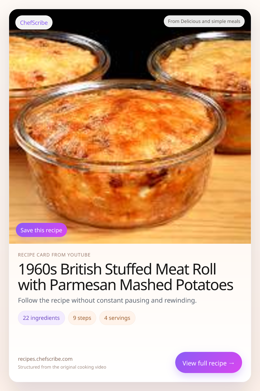 1960s British Stuffed Meat Roll with Parmesan Mashed Potatoes is shown here as a structured recipe card extracted by ChefScribe from the original YouTube cooking video by Delicious and simple meals. It is designed to make the recipe easier to follow while cooking. For the creator’s full presentation and context, watch the original video on YouTube.