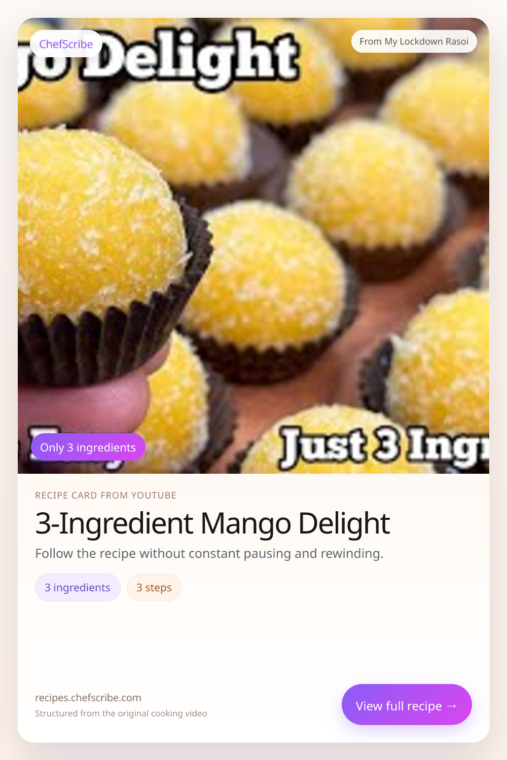3-Ingredient Mango Delight is shown here as a structured recipe card extracted by ChefScribe from the original YouTube cooking video by My Lockdown Rasoi. It is designed to make the recipe easier to follow while cooking. For the creator’s full presentation and context, watch the original video on YouTube.