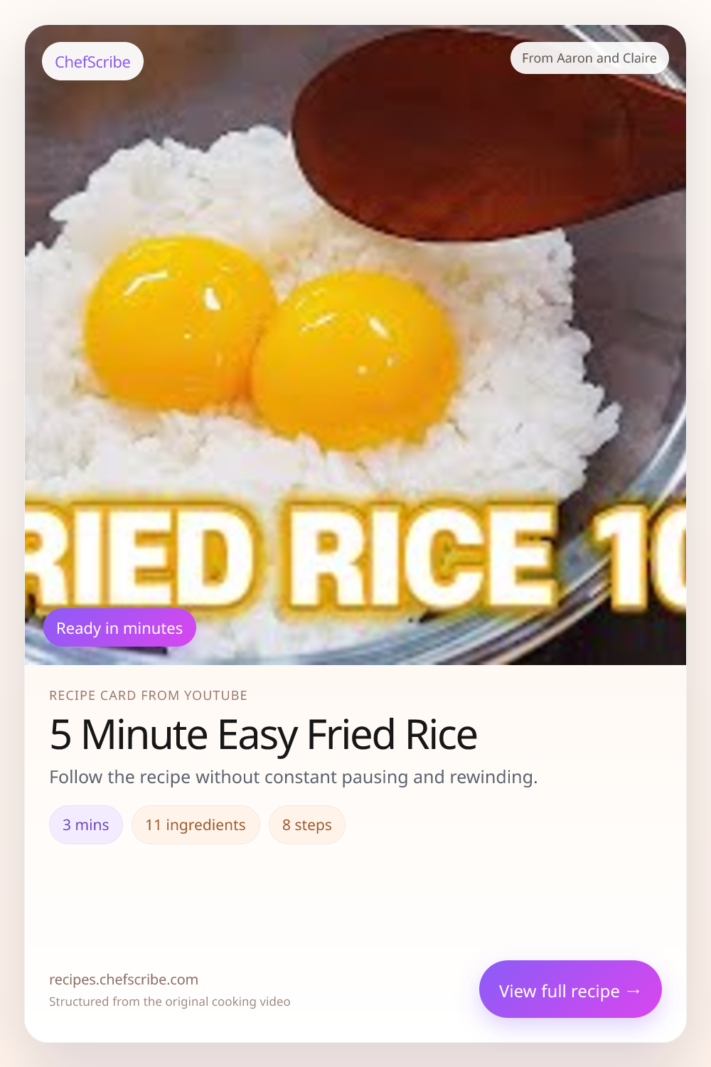 5 Minute Easy Fried Rice is shown here as a structured recipe card extracted by ChefScribe from the original YouTube cooking video by Aaron and Claire. It is designed to make the recipe easier to follow while cooking. For the creator’s full presentation and context, watch the original video on YouTube.