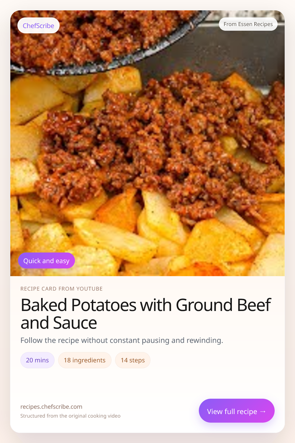 Baked Potatoes with Ground Beef and Sauce is shown here as a structured recipe card extracted by ChefScribe from the original YouTube cooking video by Essen Recipes. It is designed to make the recipe easier to follow while cooking. For the creator’s full presentation and context, watch the original video on YouTube.