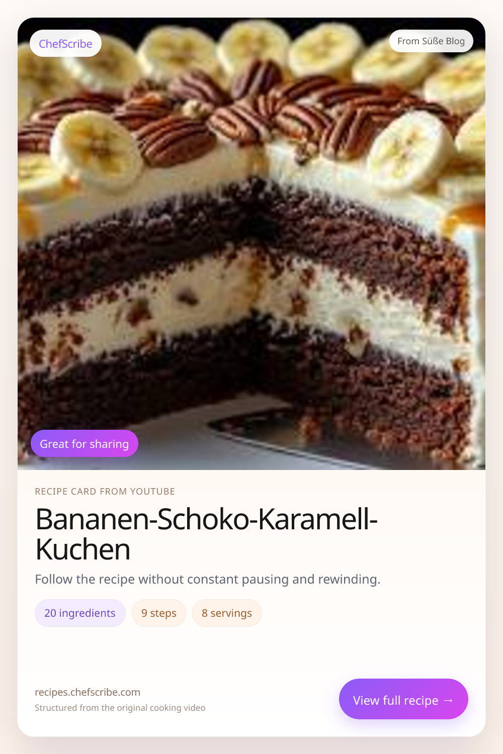 Bananen-Schoko-Karamell-Kuchen is shown here as a structured recipe card extracted by ChefScribe from the original YouTube cooking video by Süße Blog. It is designed to make the recipe easier to follow while cooking. For the creator’s full presentation and context, watch the original video on YouTube.