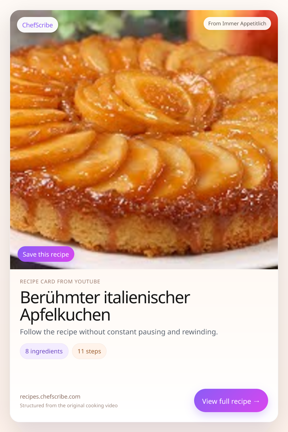 Berühmter italienischer Apfelkuchen is shown here as a structured recipe card extracted by ChefScribe from the original YouTube cooking video by Immer Appetitlich. It is designed to make the recipe easier to follow while cooking. For the creator’s full presentation and context, watch the original video on YouTube.