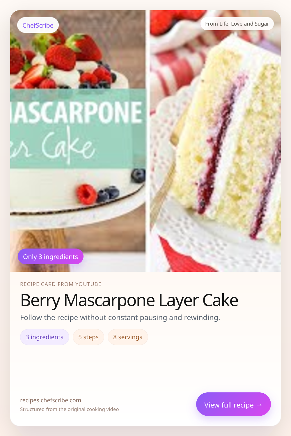 Berry Mascarpone Layer Cake is shown here as a structured recipe card extracted by ChefScribe from the original YouTube cooking video by Life, Love and Sugar. It is designed to make the recipe easier to follow while cooking. For the creator’s full presentation and context, watch the original video on YouTube.