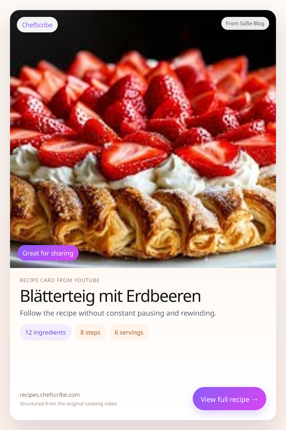 Blätterteig mit Erdbeeren is shown here as a structured recipe card extracted by ChefScribe from the original YouTube cooking video by Süße Blog. It is designed to make the recipe easier to follow while cooking. For the creator’s full presentation and context, watch the original video on YouTube.