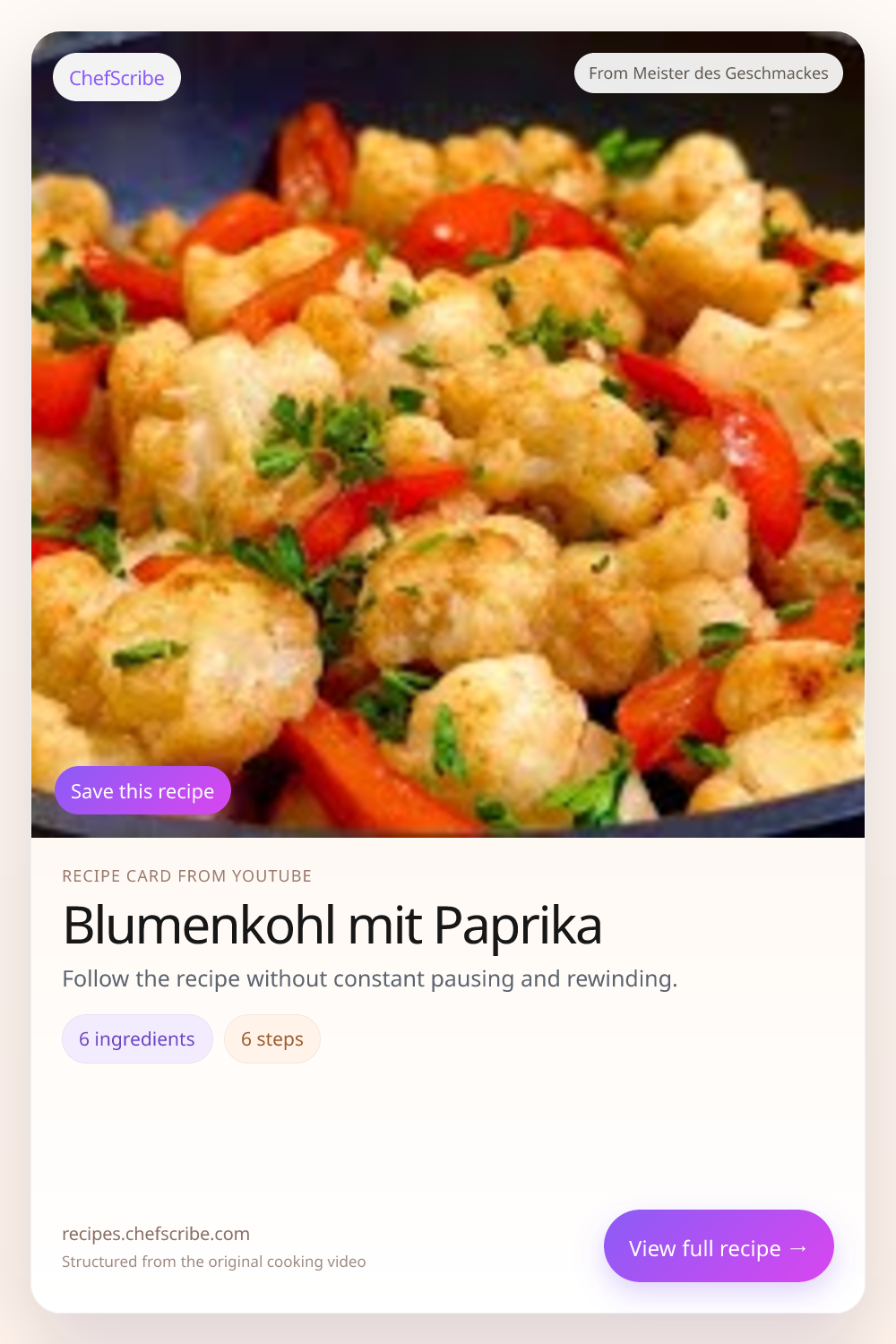 Blumenkohl mit Paprika is shown here as a structured recipe card extracted by ChefScribe from the original YouTube cooking video by Meister des Geschmackes. It is designed to make the recipe easier to follow while cooking. For the creator’s full presentation and context, watch the original video on YouTube.