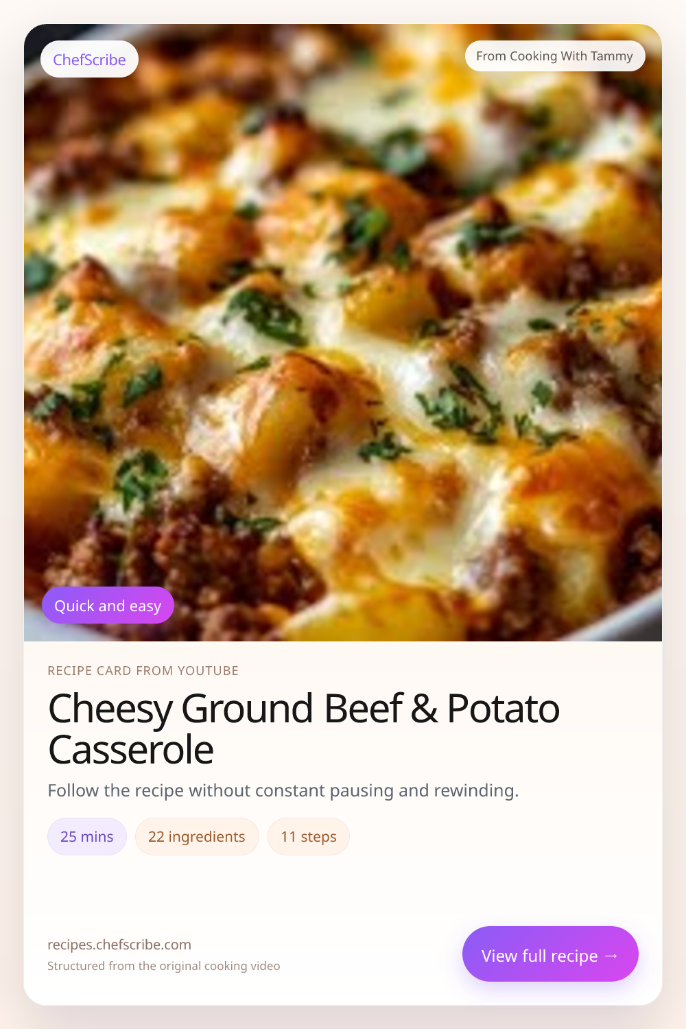 Cheesy Ground Beef & Potato Casserole is shown here as a structured recipe card extracted by ChefScribe from the original YouTube cooking video by Cooking With Tammy. It is designed to make the recipe easier to follow while cooking. For the creator’s full presentation and context, watch the original video on YouTube.