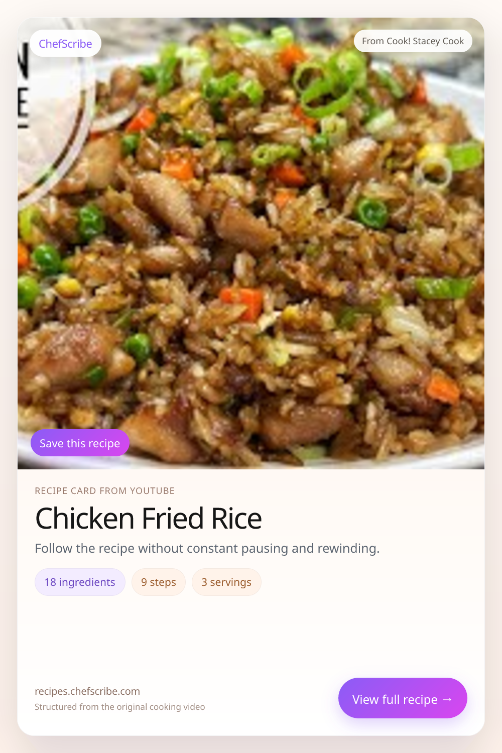 Chicken Fried Rice is shown here as a structured recipe card extracted by ChefScribe from the original YouTube cooking video by Cook! Stacey Cook. It is designed to make the recipe easier to follow while cooking. For the creator’s full presentation and context, watch the original video on YouTube.