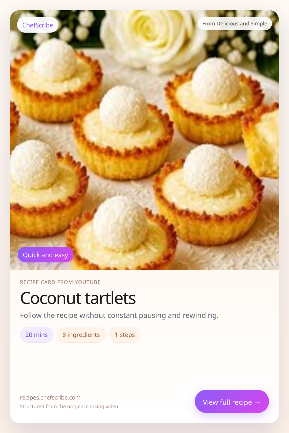 Coconut tartlets is shown here as a structured recipe card extracted by ChefScribe from the original YouTube cooking video by Delicious and Simple. It is designed to make the recipe easier to follow while cooking. For the creator’s full presentation and context, watch the original video on YouTube.