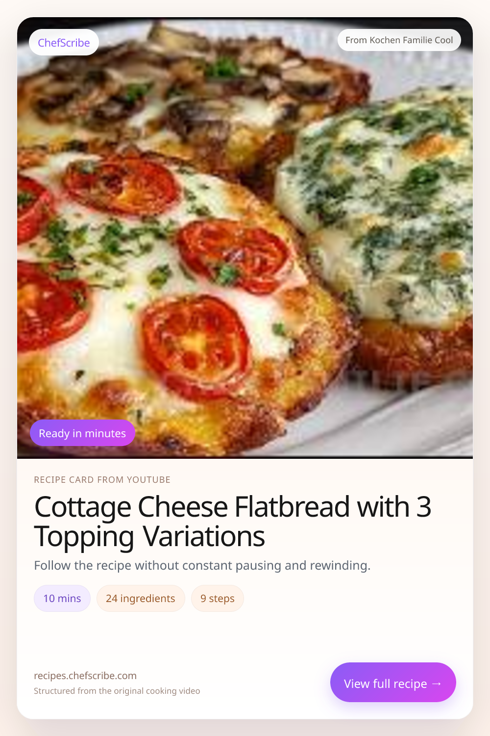 Cottage Cheese Flatbread with 3 Topping Variations is shown here as a structured recipe card extracted by ChefScribe from the original YouTube cooking video by Kochen Familie Cool. It is designed to make the recipe easier to follow while cooking. For the creator’s full presentation and context, watch the original video on YouTube.