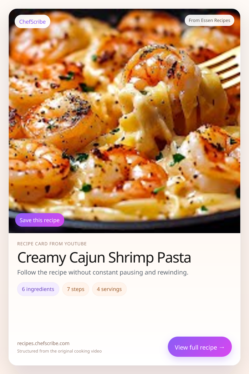 Creamy Cajun Shrimp Pasta is shown here as a structured recipe card extracted by ChefScribe from the original YouTube cooking video by Essen Recipes. It is designed to make the recipe easier to follow while cooking. For the creator’s full presentation and context, watch the original video on YouTube.