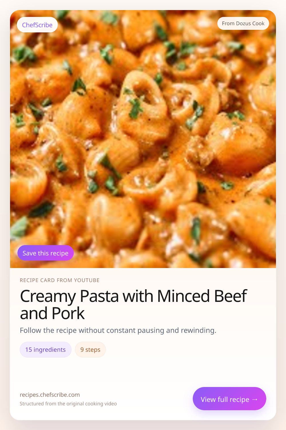 Creamy Pasta with Minced Beef and Pork is shown here as a structured recipe card extracted by ChefScribe from the original YouTube cooking video by Dozus Cook. It is designed to make the recipe easier to follow while cooking. For the creator’s full presentation and context, watch the original video on YouTube.