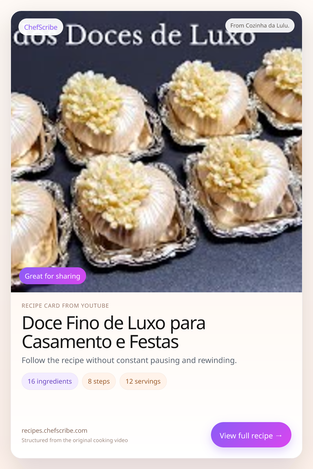 Doce Fino de Luxo para Casamento e Festas is shown here as a structured recipe card extracted by ChefScribe from the original YouTube cooking video by Cozinha da Lulu.. It is designed to make the recipe easier to follow while cooking. For the creator’s full presentation and context, watch the original video on YouTube.