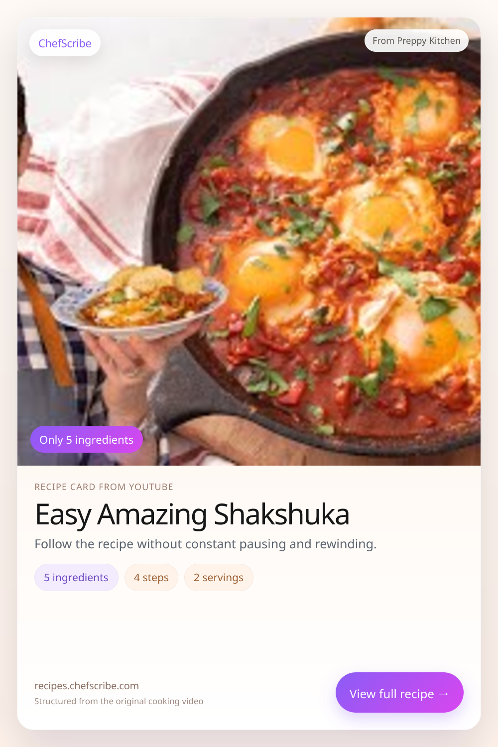 Easy Amazing Shakshuka is shown here as a structured recipe card extracted by ChefScribe from the original YouTube cooking video by Preppy Kitchen. It is designed to make the recipe easier to follow while cooking. For the creator’s full presentation and context, watch the original video on YouTube.