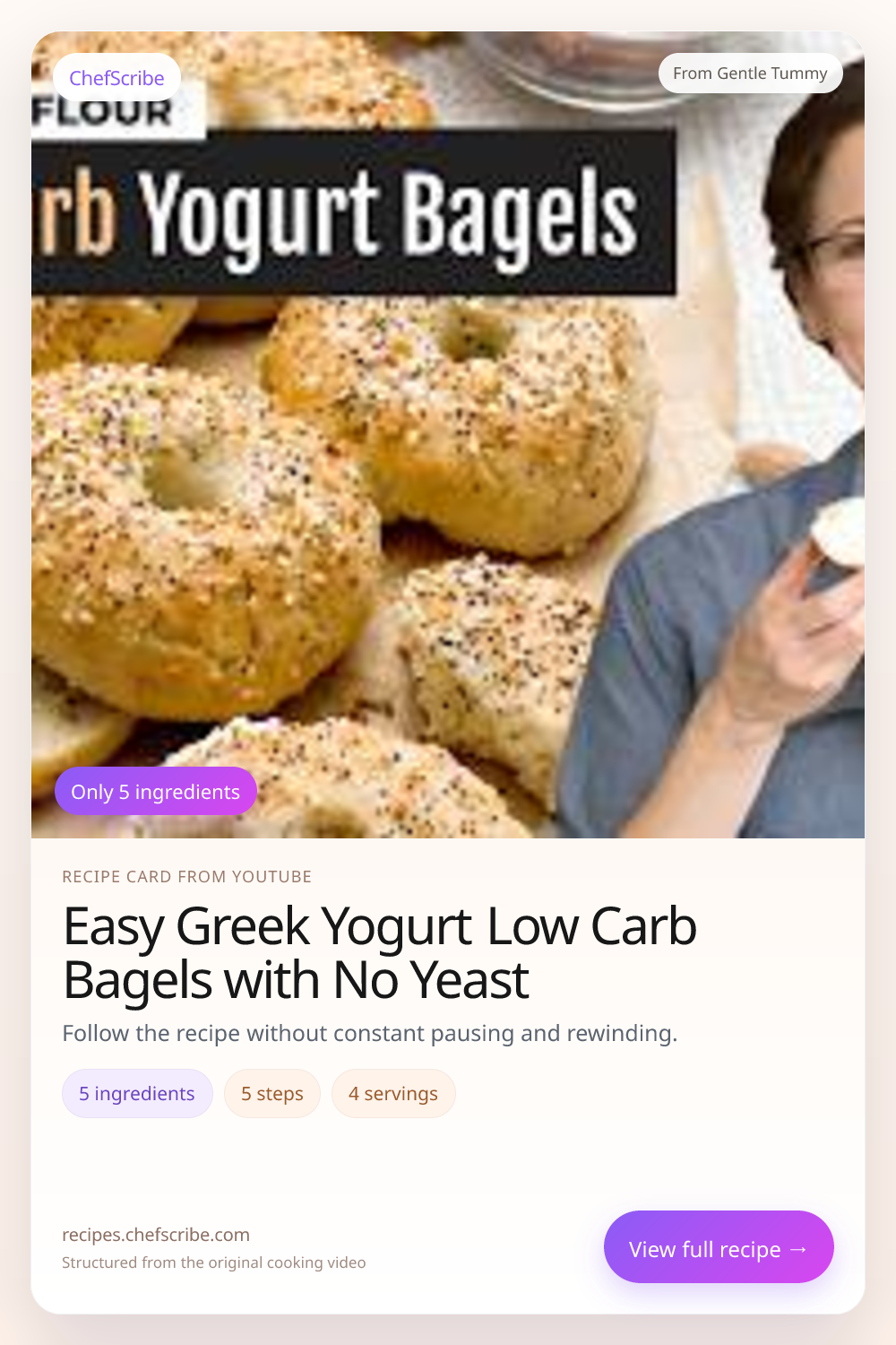 Easy Greek Yogurt Low Carb Bagels with No Yeast is shown here as a structured recipe card extracted by ChefScribe from the original YouTube cooking video by Gentle Tummy. It is designed to make the recipe easier to follow while cooking. For the creator’s full presentation and context, watch the original video on YouTube.