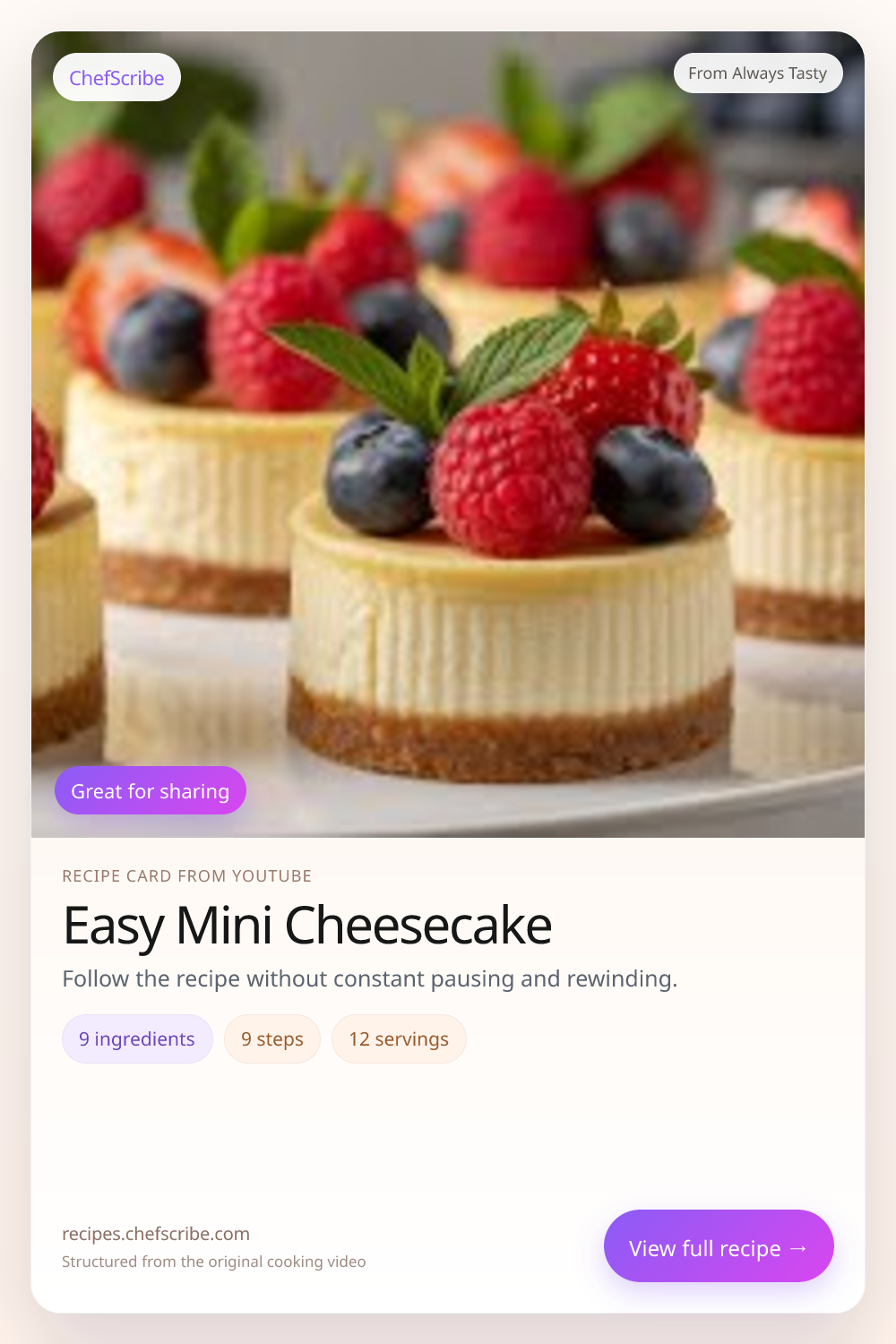 Easy Mini Cheesecake is shown here as a structured recipe card extracted by ChefScribe from the original YouTube cooking video by Always Tasty. It is designed to make the recipe easier to follow while cooking. For the creator’s full presentation and context, watch the original video on YouTube.