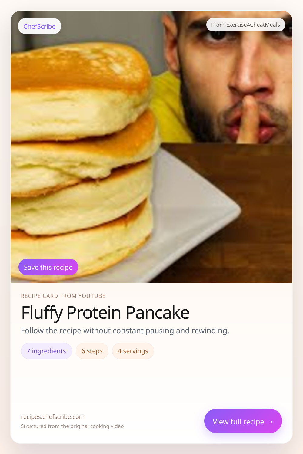 Fluffy Protein Pancake is shown here as a structured recipe card extracted by ChefScribe from the original YouTube cooking video by Exercise4CheatMeals. It is designed to make the recipe easier to follow while cooking. For the creator’s full presentation and context, watch the original video on YouTube.