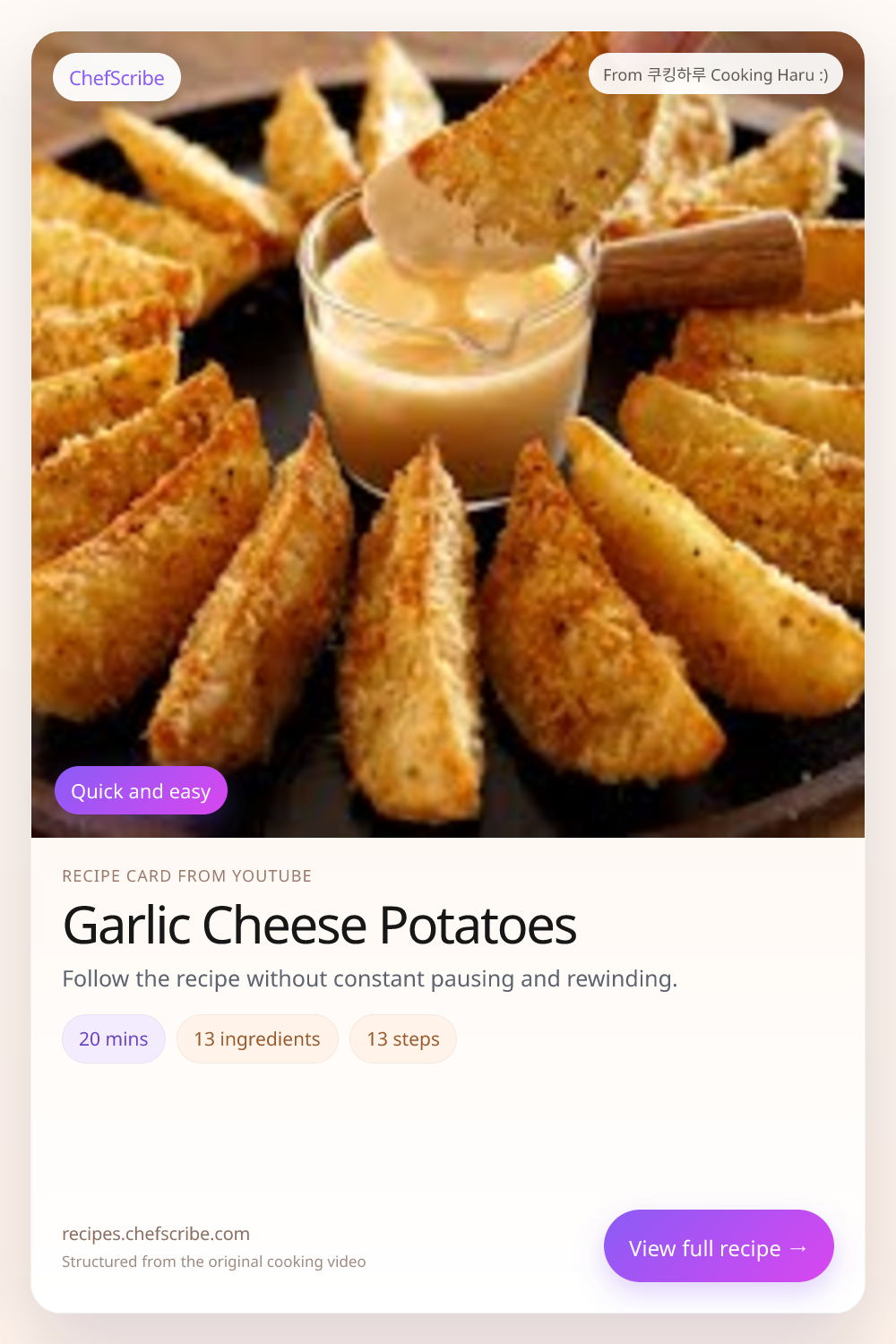 Garlic Cheese Potatoes is shown here as a structured recipe card extracted by ChefScribe from the original YouTube cooking video by 쿠킹하루 Cooking Haru :). It is designed to make the recipe easier to follow while cooking. For the creator’s full presentation and context, watch the original video on YouTube.