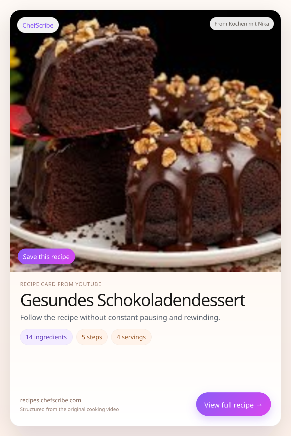 Gesundes Schokoladendessert is shown here as a structured recipe card extracted by ChefScribe from the original YouTube cooking video by Kochen mit Nika. It is designed to make the recipe easier to follow while cooking. For the creator’s full presentation and context, watch the original video on YouTube.
