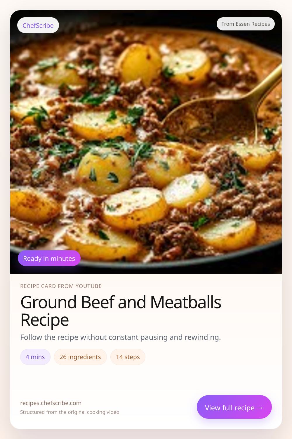 Ground Beef and Meatballs Recipe is shown here as a structured recipe card extracted by ChefScribe from the original YouTube cooking video by Essen Recipes. It is designed to make the recipe easier to follow while cooking. For the creator’s full presentation and context, watch the original video on YouTube.