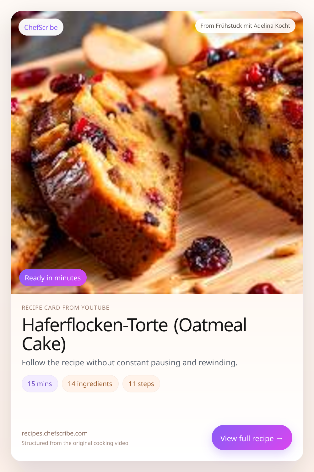 Haferflocken-Torte (Oatmeal Cake) is shown here as a structured recipe card extracted by ChefScribe from the original YouTube cooking video by Frühstück mit Adelina Kocht. It is designed to make the recipe easier to follow while cooking. For the creator’s full presentation and context, watch the original video on YouTube.