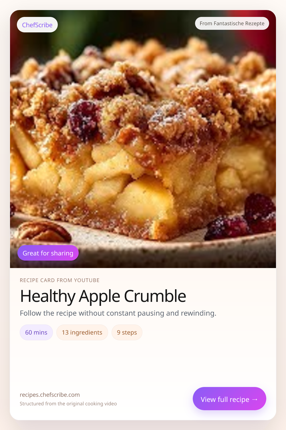 Healthy Apple Crumble is shown here as a structured recipe card extracted by ChefScribe from the original YouTube cooking video by Fantastische Rezepte. It is designed to make the recipe easier to follow while cooking. For the creator’s full presentation and context, watch the original video on YouTube.