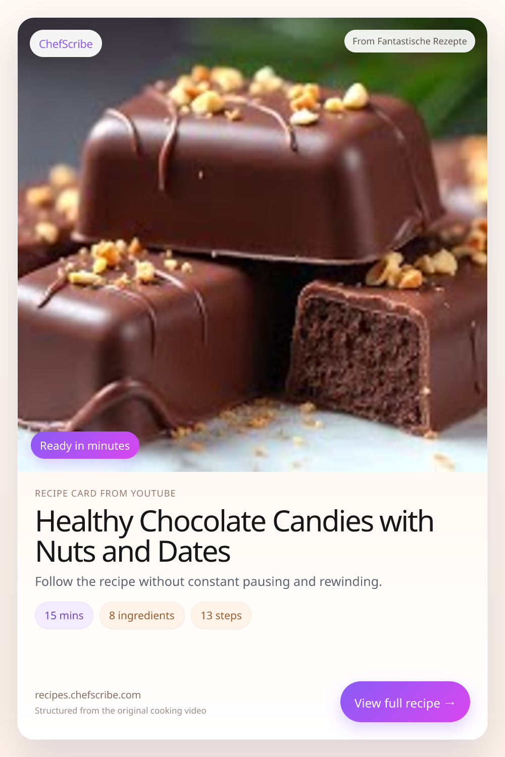 Healthy Chocolate Candies with Nuts and Dates is shown here as a structured recipe card extracted by ChefScribe from the original YouTube cooking video by Fantastische Rezepte. It is designed to make the recipe easier to follow while cooking. For the creator’s full presentation and context, watch the original video on YouTube.