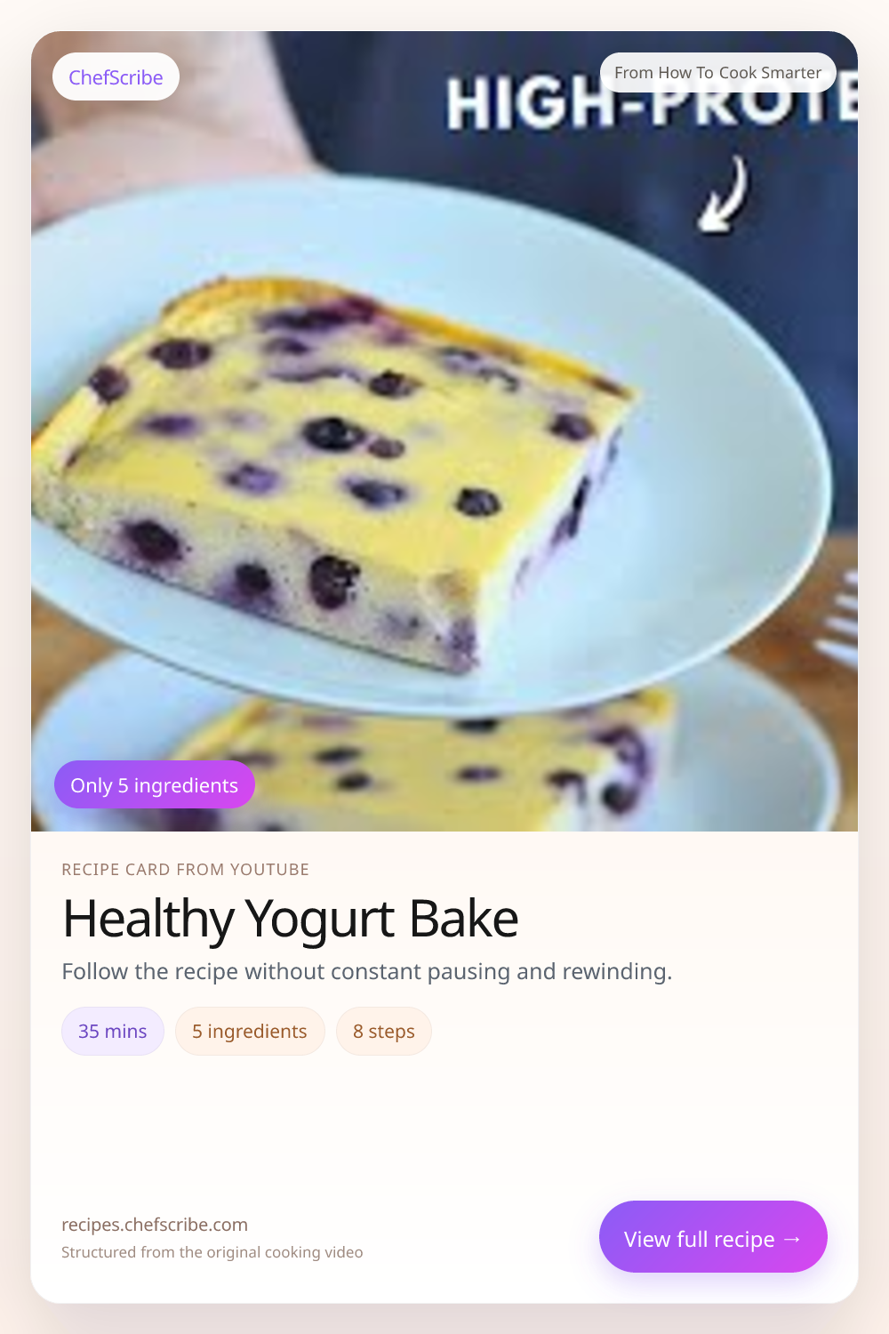 Healthy Yogurt Bake is shown here as a structured recipe card extracted by ChefScribe from the original YouTube cooking video by How To Cook Smarter. It is designed to make the recipe easier to follow while cooking. For the creator’s full presentation and context, watch the original video on YouTube.