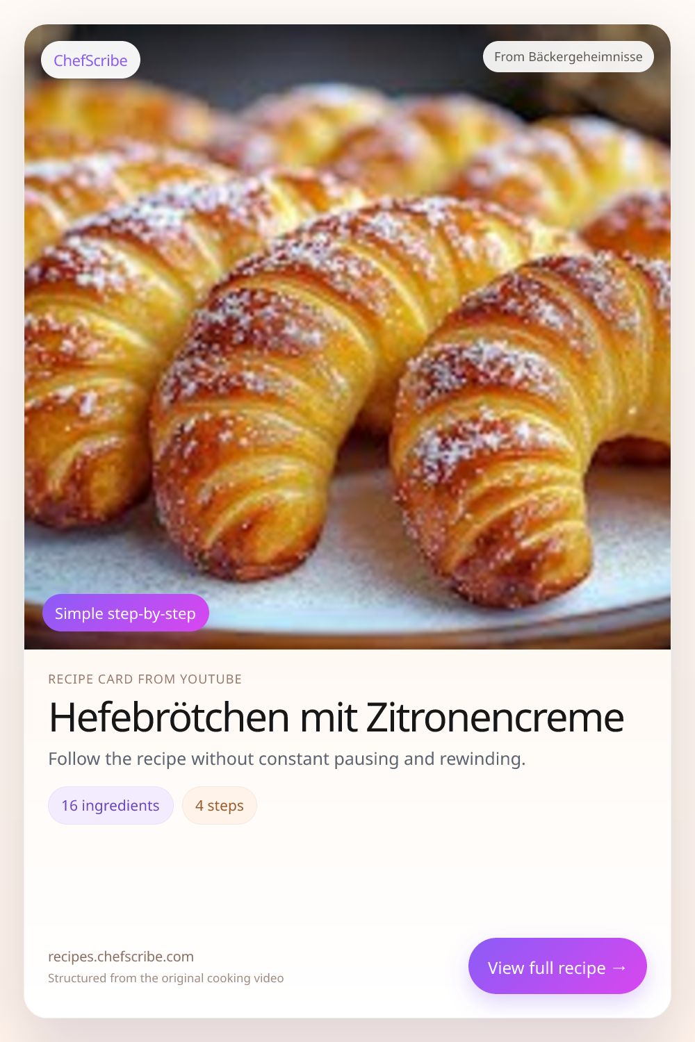 Hefebrötchen mit Zitronencreme is shown here as a structured recipe card extracted by ChefScribe from the original YouTube cooking video by Bäckergeheimnisse. It is designed to make the recipe easier to follow while cooking. For the creator’s full presentation and context, watch the original video on YouTube.