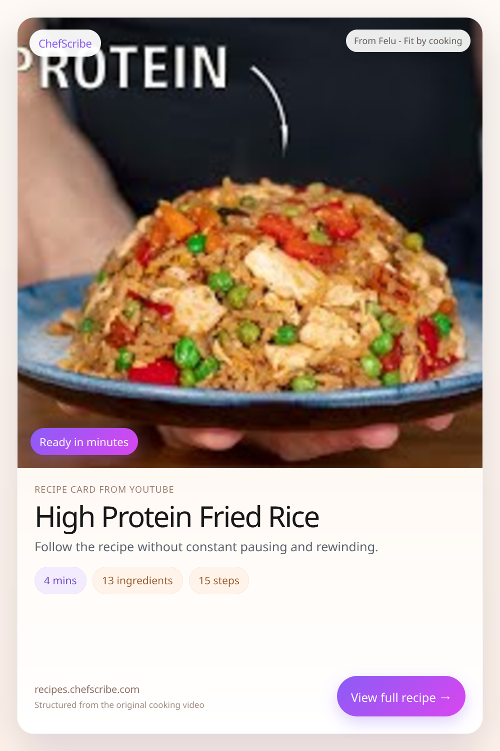 High Protein Fried Rice is shown here as a structured recipe card extracted by ChefScribe from the original YouTube cooking video by Felu - Fit by cooking. It is designed to make the recipe easier to follow while cooking. For the creator’s full presentation and context, watch the original video on YouTube.