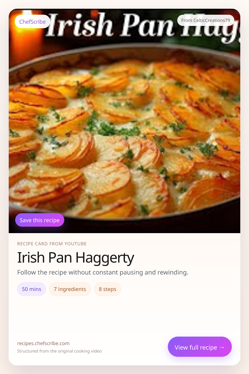 Irish Pan Haggerty is shown here as a structured recipe card extracted by ChefScribe from the original YouTube cooking video by CelticCreations79. It is designed to make the recipe easier to follow while cooking. For the creator’s full presentation and context, watch the original video on YouTube.