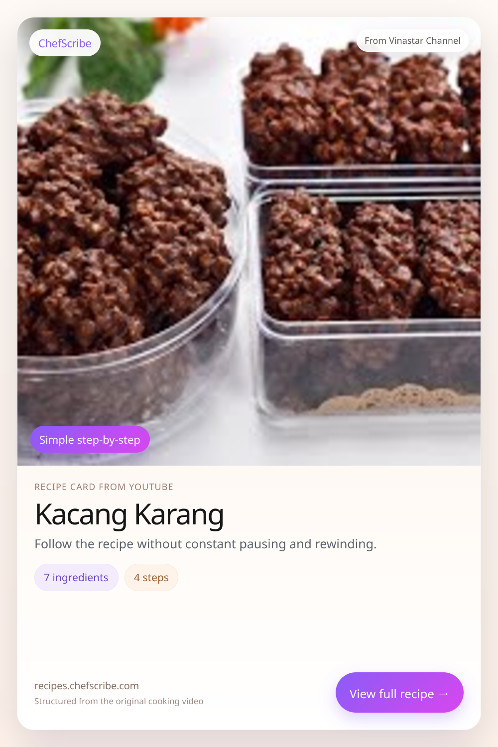 Kacang Karang is shown here as a structured recipe card extracted by ChefScribe from the original YouTube cooking video by Vinastar Channel. It is designed to make the recipe easier to follow while cooking. For the creator’s full presentation and context, watch the original video on YouTube.