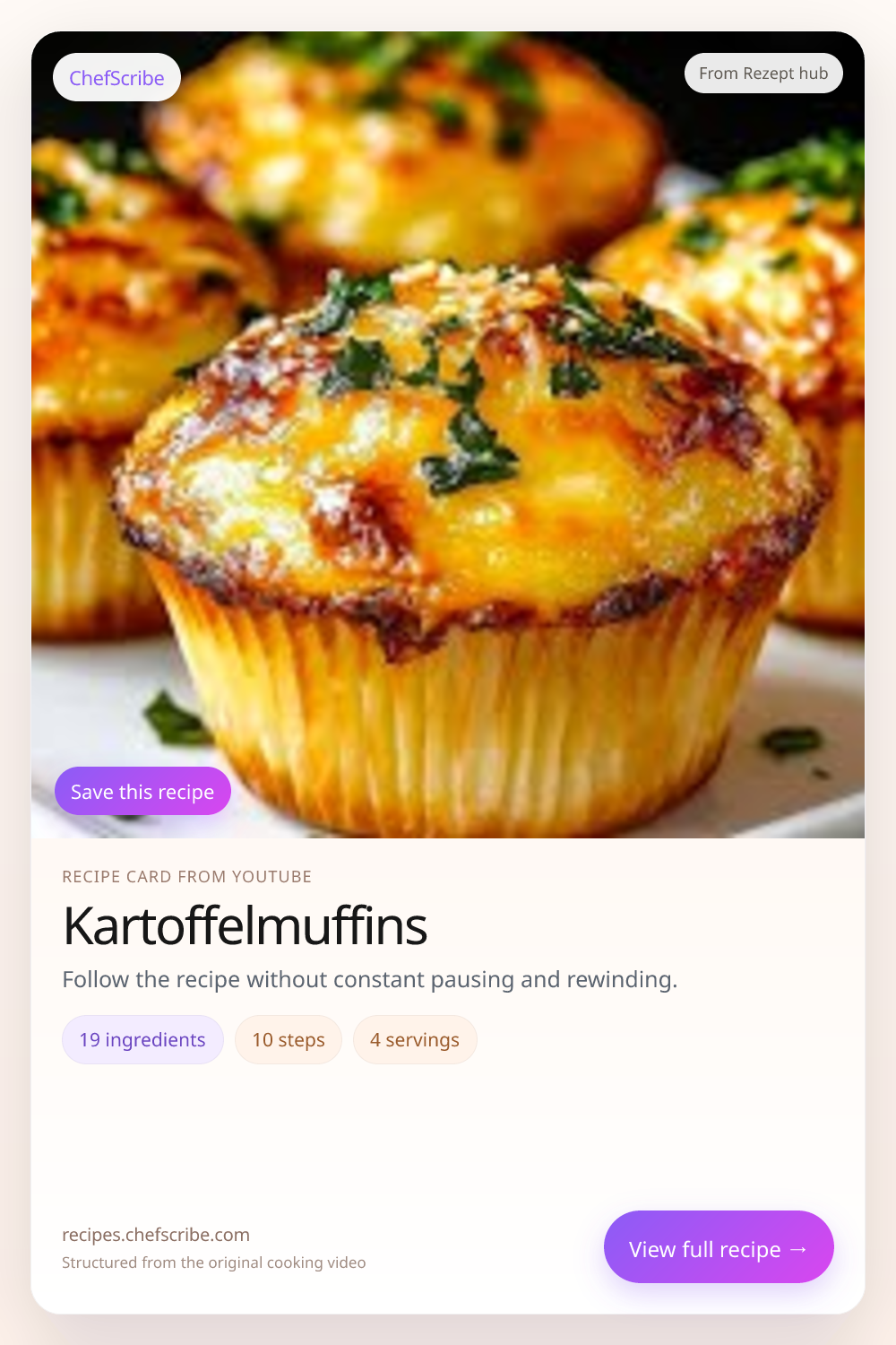 Kartoffelmuffins is shown here as a structured recipe card extracted by ChefScribe from the original YouTube cooking video by Rezept hub. It is designed to make the recipe easier to follow while cooking. For the creator’s full presentation and context, watch the original video on YouTube.