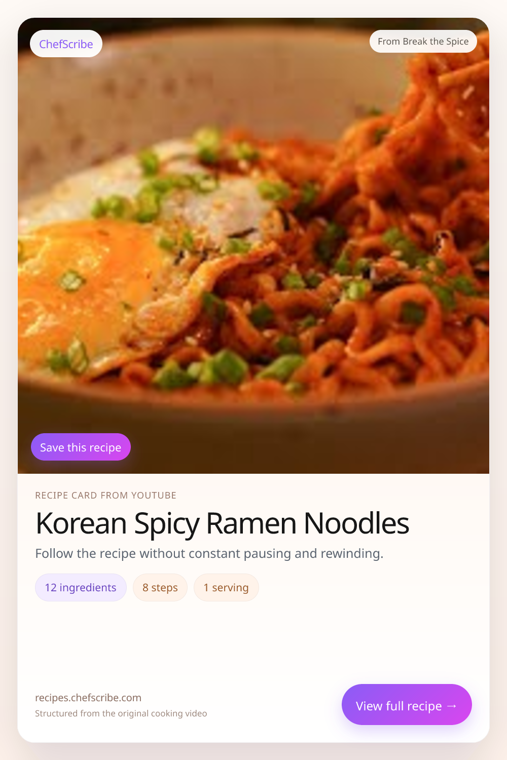 Korean Spicy Ramen Noodles is shown here as a structured recipe card extracted by ChefScribe from the original YouTube cooking video by Break the Spice. It is designed to make the recipe easier to follow while cooking. For the creator’s full presentation and context, watch the original video on YouTube.