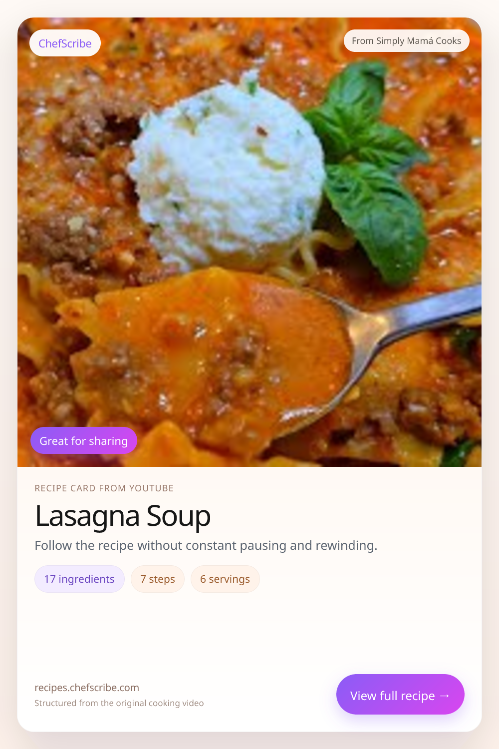 Lasagna Soup is shown here as a structured recipe card extracted by ChefScribe from the original YouTube cooking video by Simply Mamá Cooks. It is designed to make the recipe easier to follow while cooking. For the creator’s full presentation and context, watch the original video on YouTube.