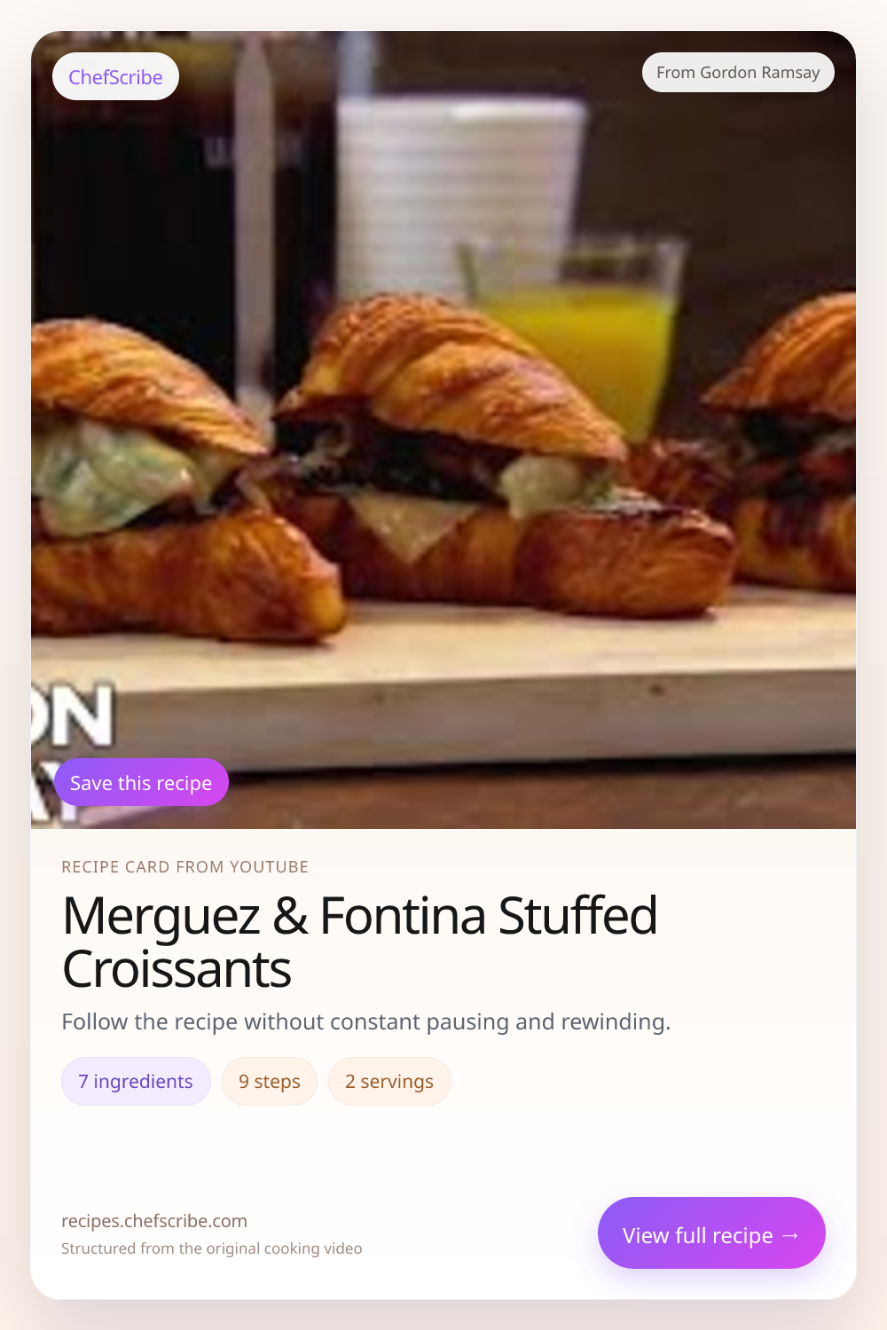 Merguez & Fontina Stuffed Croissants is shown here as a structured recipe card extracted by ChefScribe from the original YouTube cooking video by Gordon Ramsay. It is designed to make the recipe easier to follow while cooking. For the creator’s full presentation and context, watch the original video on YouTube.