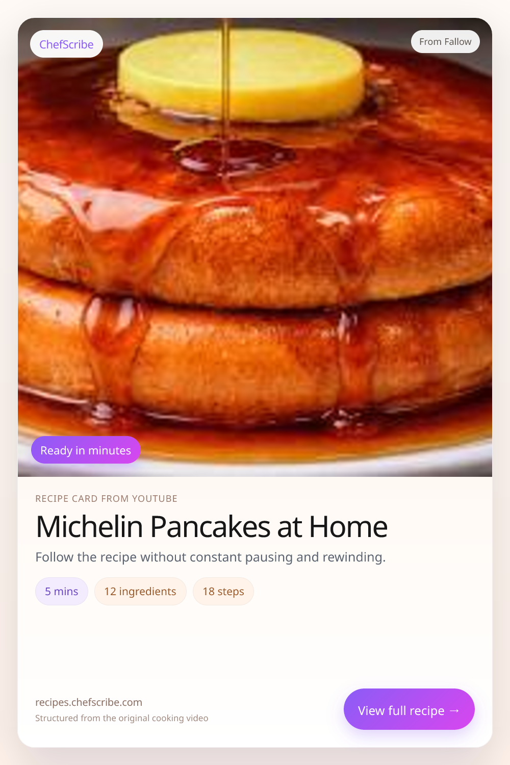 Michelin Pancakes at Home is shown here as a structured recipe card extracted by ChefScribe from the original YouTube cooking video by Fallow. It is designed to make the recipe easier to follow while cooking. For the creator’s full presentation and context, watch the original video on YouTube.