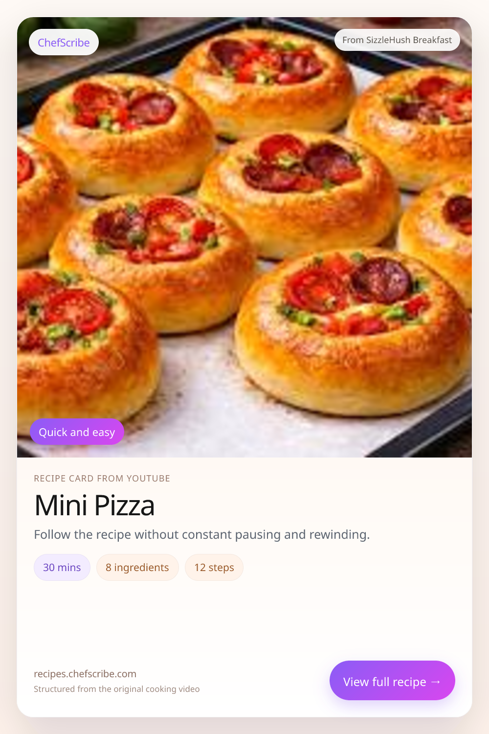 Mini Pizza is shown here as a structured recipe card extracted by ChefScribe from the original YouTube cooking video by SizzleHush Breakfast. It is designed to make the recipe easier to follow while cooking. For the creator’s full presentation and context, watch the original video on YouTube.