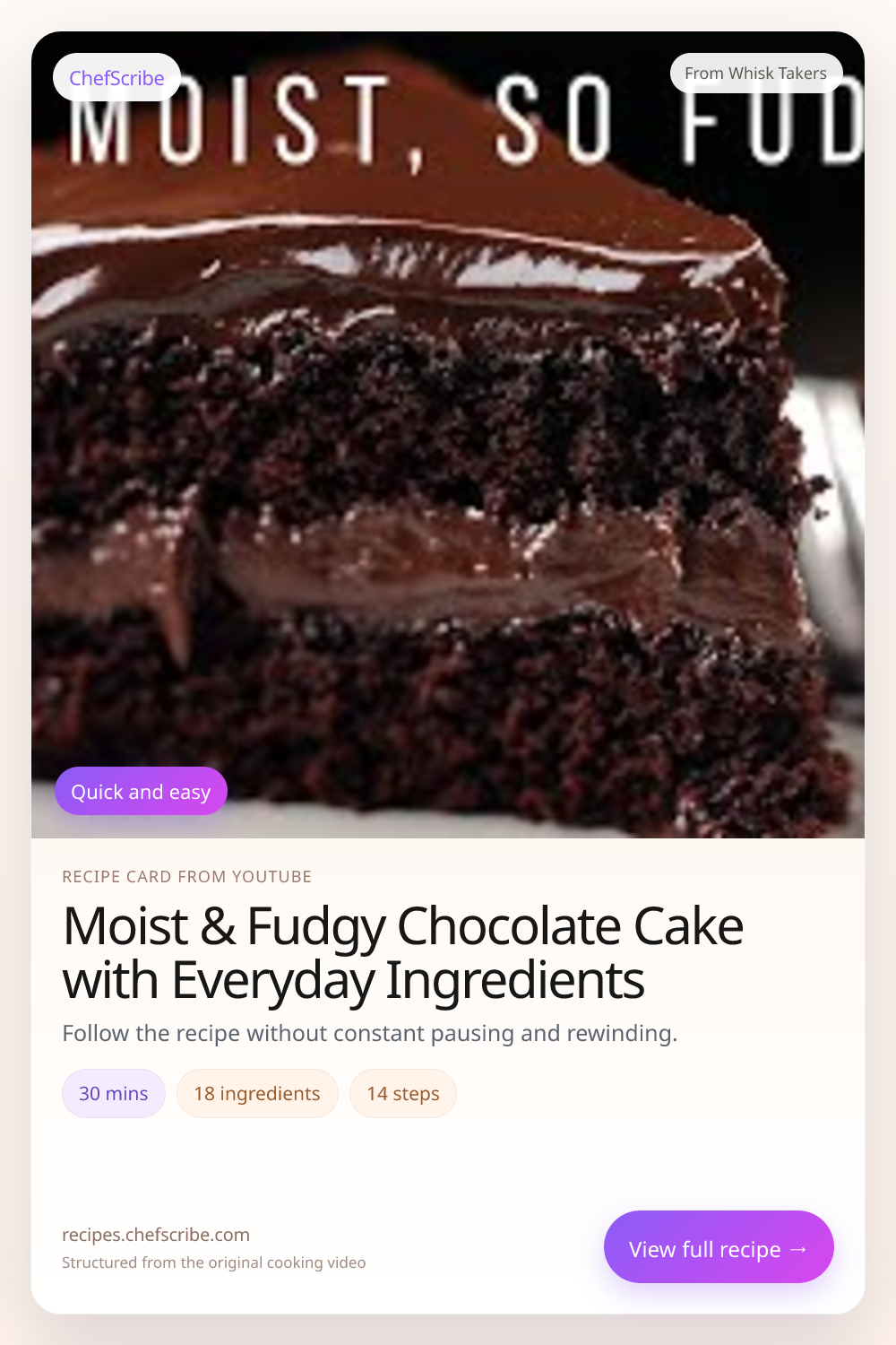 Whisk Takers on YouTubeMoist & Fudgy Chocolate Cake with Everyday Ingredients is shown here as a structured recipe card extracted by ChefScribe from the original YouTube cooking video by Whisk Takers. It is designed to make the recipe easier to follow while cooking. For the creator’s full presentation and context, watch the original video on YouTube.