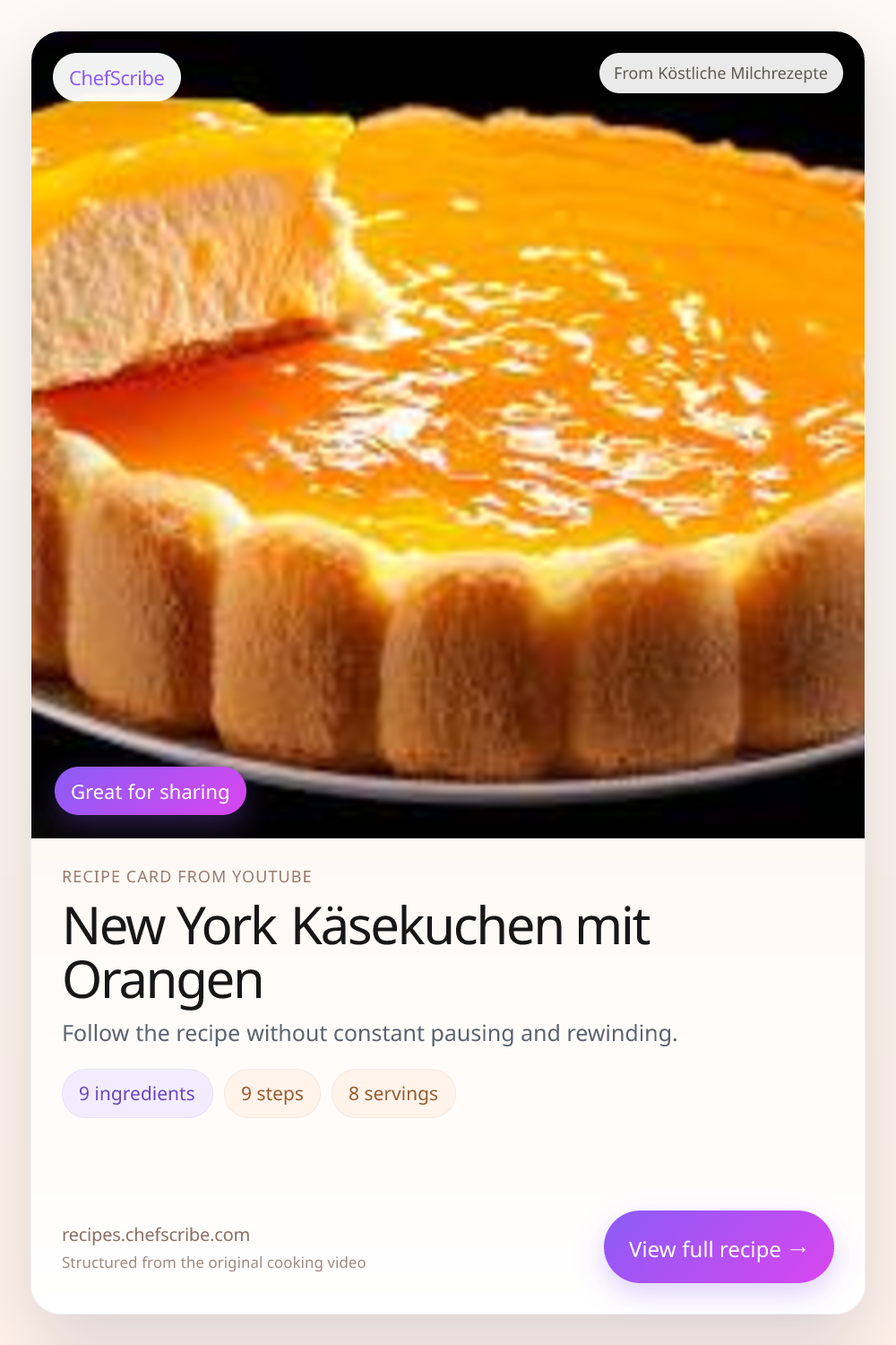 New York Käsekuchen mit Orangen is shown here as a structured recipe card extracted by ChefScribe from the original YouTube cooking video by Köstliche Milchrezepte. It is designed to make the recipe easier to follow while cooking. For the creator’s full presentation and context, watch the original video on YouTube.
