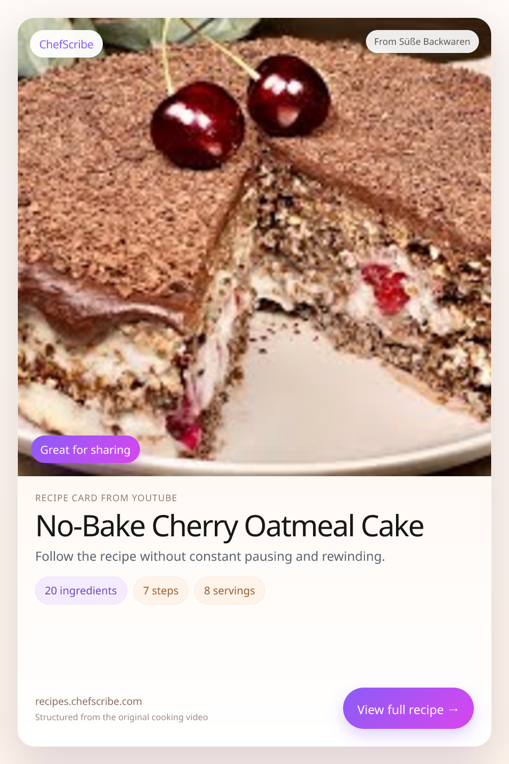 No-Bake Cherry Oatmeal Cake is shown here as a structured recipe card extracted by ChefScribe from the original YouTube cooking video by Süße Backwaren. It is designed to make the recipe easier to follow while cooking. For the creator’s full presentation and context, watch the original video on YouTube.