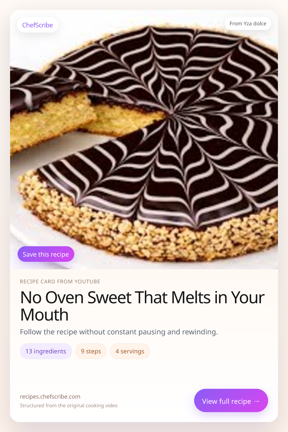 No Oven Sweet That Melts in Your Mouth is shown here as a structured recipe card extracted by ChefScribe from the original YouTube cooking video by Yza dolce. It is designed to make the recipe easier to follow while cooking. For the creator’s full presentation and context, watch the original video on YouTube.