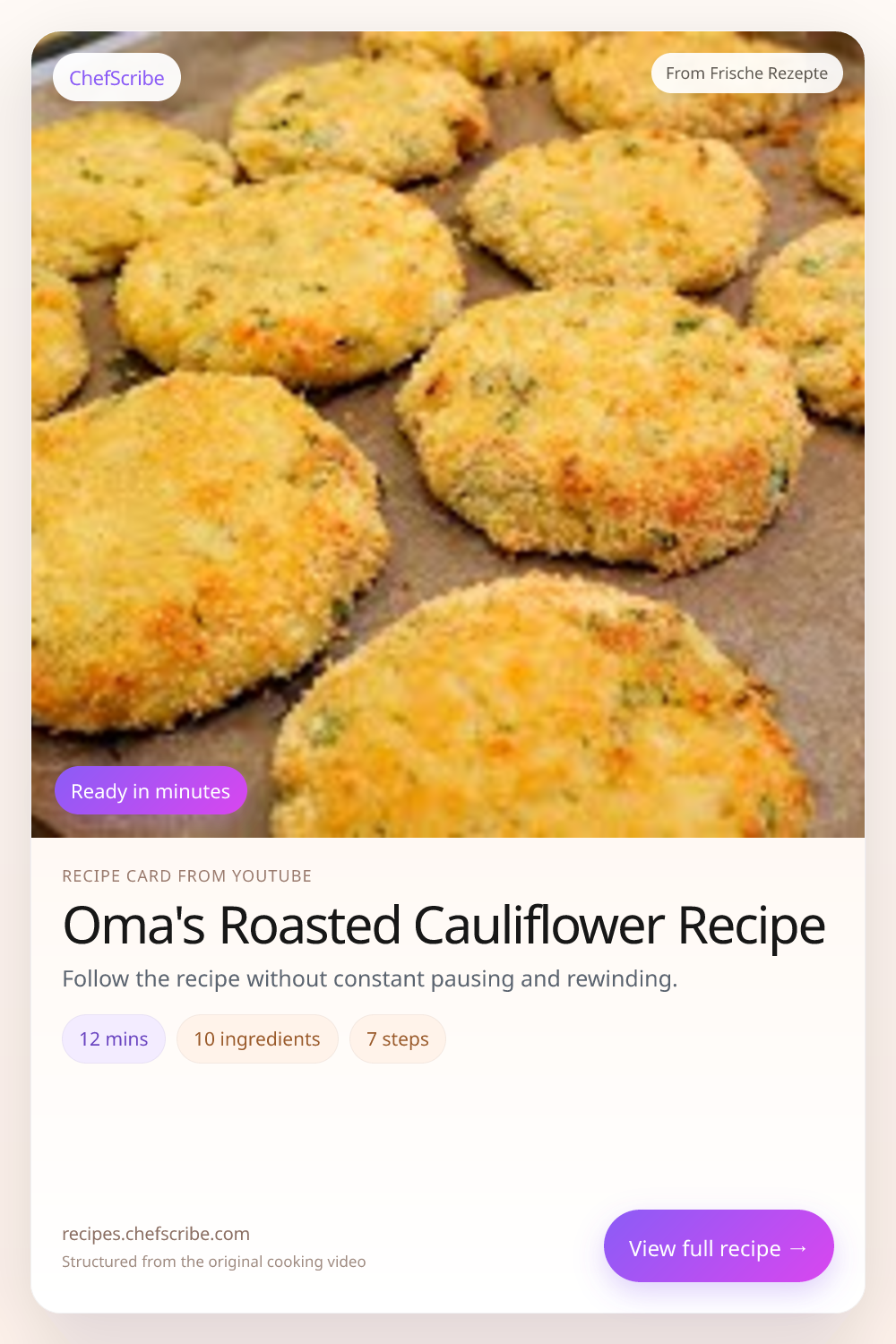 Oma's Roasted Cauliflower Recipe is shown here as a structured recipe card extracted by ChefScribe from the original YouTube cooking video by Frische Rezepte. It is designed to make the recipe easier to follow while cooking. For the creator’s full presentation and context, watch the original video on YouTube.