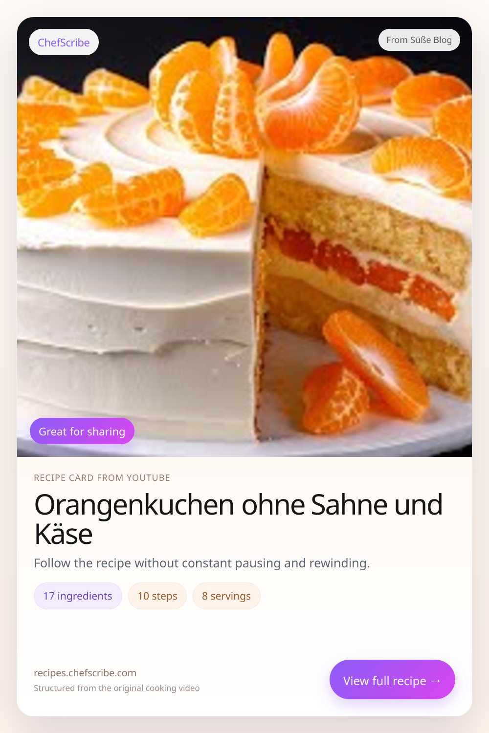 Orangenkuchen ohne Sahne und Käse is shown here as a structured recipe card extracted by ChefScribe from the original YouTube cooking video by Süße Blog. It is designed to make the recipe easier to follow while cooking. For the creator’s full presentation and context, watch the original video on YouTube.