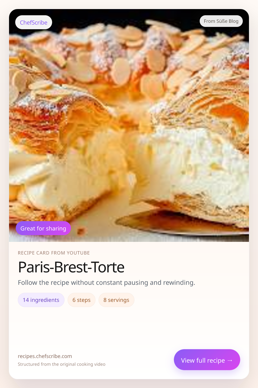 Paris-Brest-Torte is shown here as a structured recipe card extracted by ChefScribe from the original YouTube cooking video by Süße Blog. It is designed to make the recipe easier to follow while cooking. For the creator’s full presentation and context, watch the original video on YouTube.