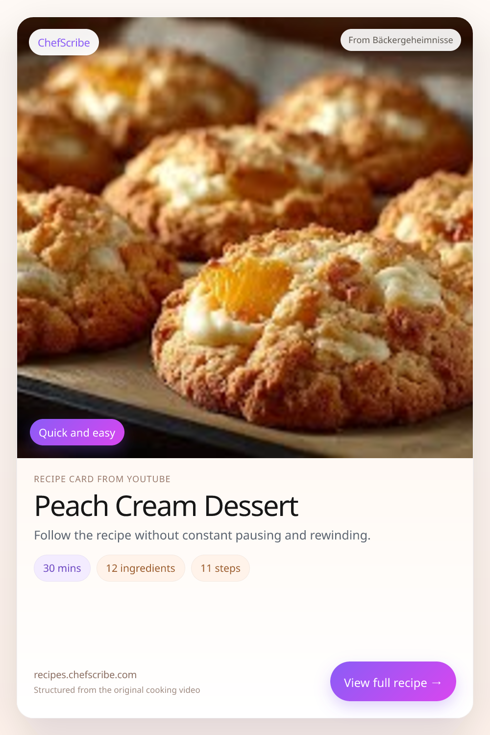Peach Cream Dessert is shown here as a structured recipe card extracted by ChefScribe from the original YouTube cooking video by Bäckergeheimnisse. It is designed to make the recipe easier to follow while cooking. For the creator’s full presentation and context, watch the original video on YouTube.