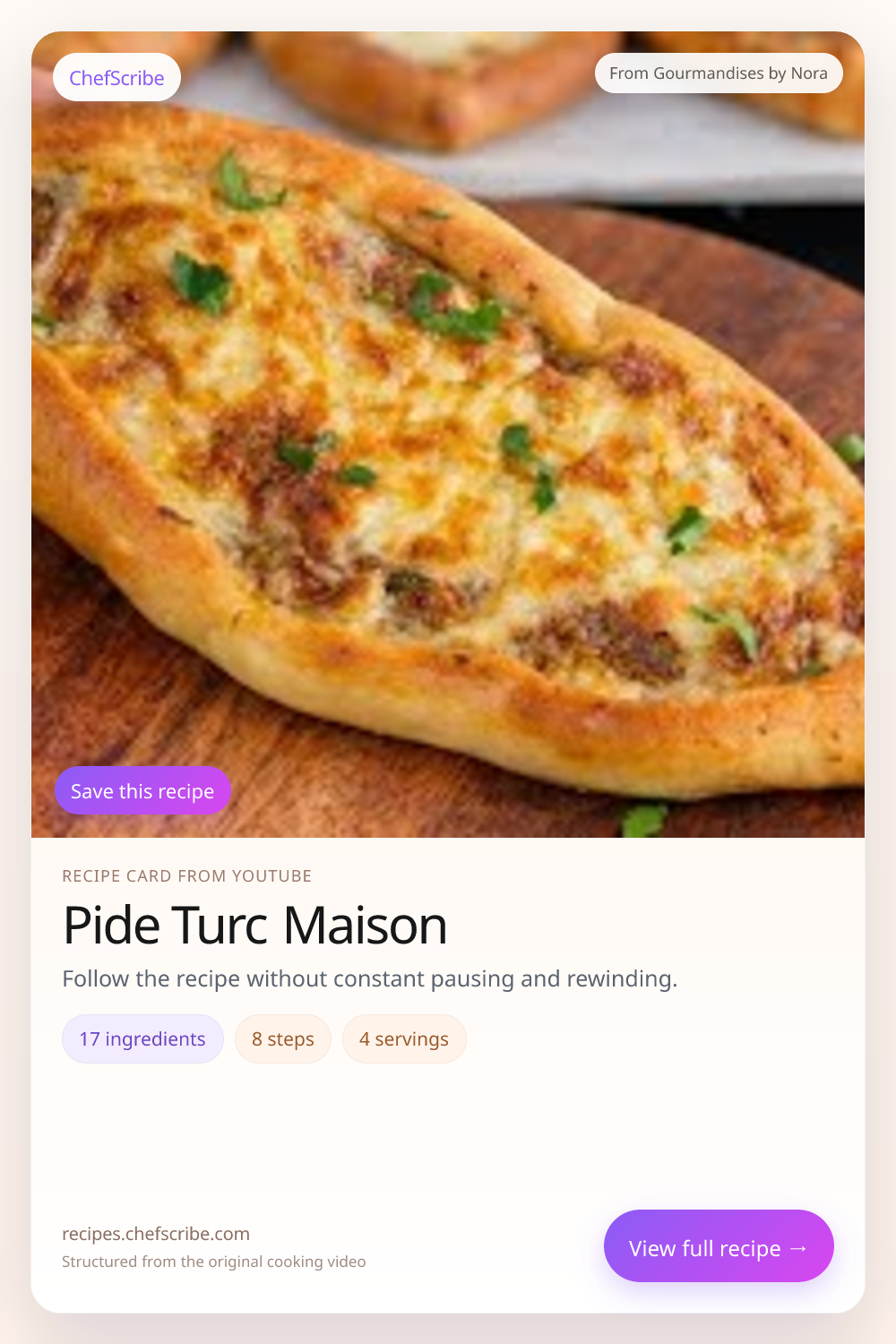 Pide Turc Maison is shown here as a structured recipe card extracted by ChefScribe from the original YouTube cooking video by Gourmandises by Nora. It is designed to make the recipe easier to follow while cooking. For the creator’s full presentation and context, watch the original video on YouTube.