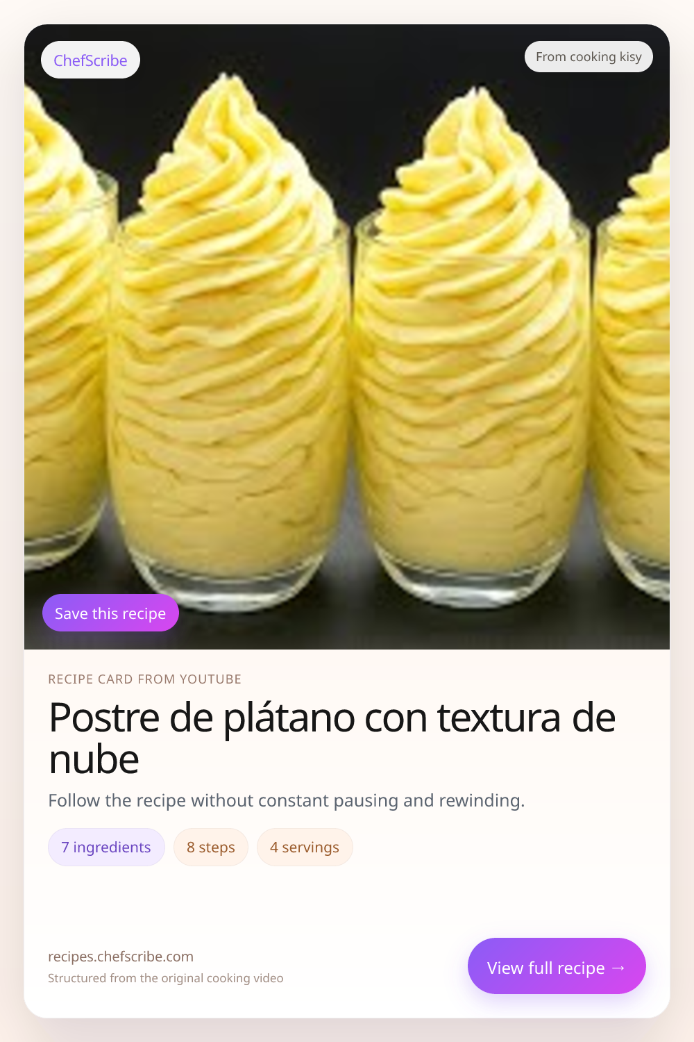 Postre de plátano con textura de nube is shown here as a structured recipe card extracted by ChefScribe from the original YouTube cooking video by cooking kisy. It is designed to make the recipe easier to follow while cooking. For the creator’s full presentation and context, watch the original video on YouTube.