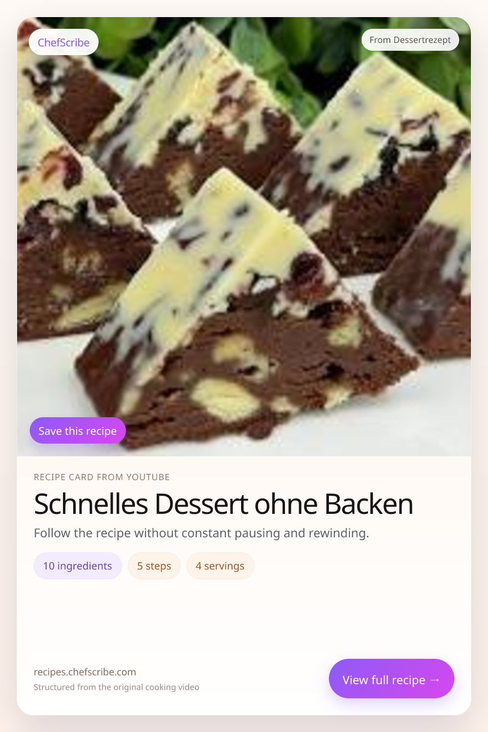 Schnelles Dessert ohne Backen is shown here as a structured recipe card extracted by ChefScribe from the original YouTube cooking video by Dessertrezept. It is designed to make the recipe easier to follow while cooking. For the creator’s full presentation and context, watch the original video on YouTube.