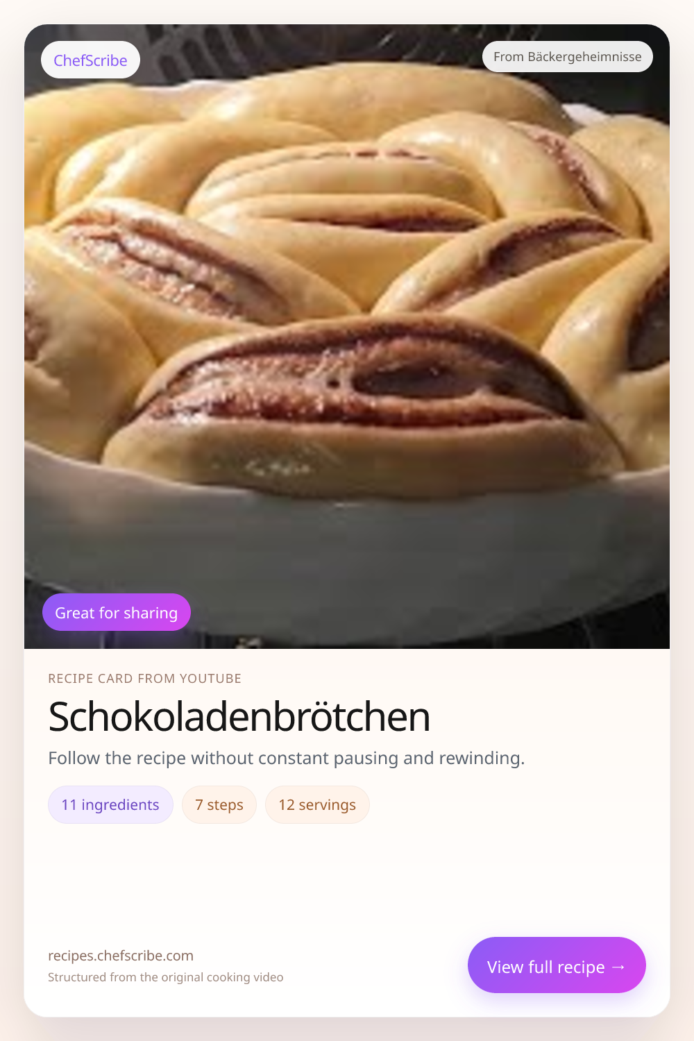 Schokoladenbrötchen is shown here as a structured recipe card extracted by ChefScribe from the original YouTube cooking video by Bäckergeheimnisse. It is designed to make the recipe easier to follow while cooking. For the creator’s full presentation and context, watch the original video on YouTube.