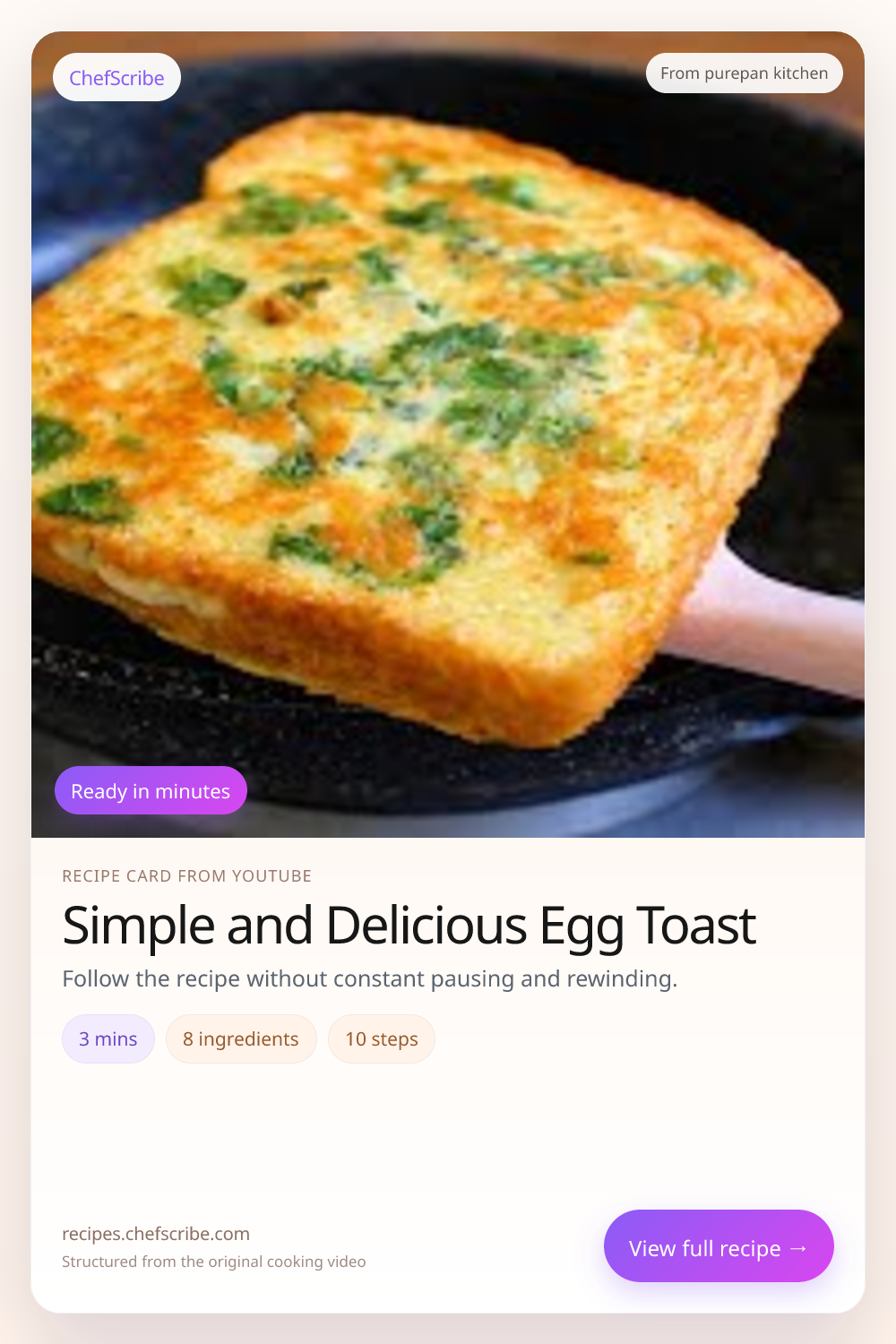 Simple and Delicious Egg Toast is shown here as a structured recipe card extracted by ChefScribe from the original YouTube cooking video by purepan kitchen. It is designed to make the recipe easier to follow while cooking. For the creator’s full presentation and context, watch the original video on YouTube.